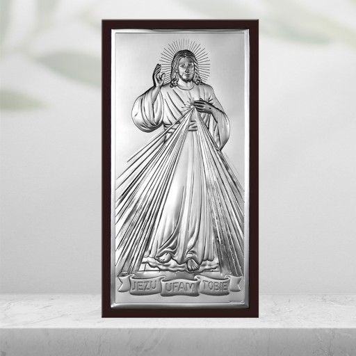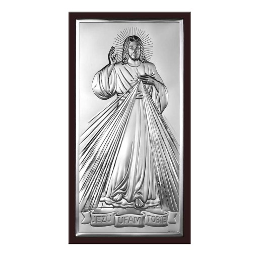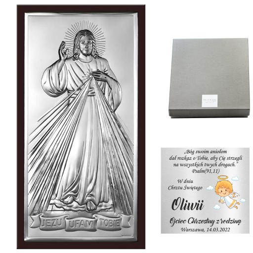 Srebrny obraz sakralny włoskiej firmy BELTRAMI GIOIELLI przedstawiający wizerunek Jezusa Miłosiernego z napisem JEZU UFAM TOBIE. Całość zamknięta w formie klasycznego prostokąta na brązowym drewnie oraz otoczona szykowną ramką. Obrazek idealnie nadaje się jako prezent na Chrzest Święty, Pierwszą Komunię Świętą, Bierzmowanie, Rocznica Ślubu oraz inne ważne okoliczności. Pamiątka przystosowana do postawienia na półce lub zawieszenia na ścianie, nada elegancji każdemu wnętrzu. Dzięki osobistej dedykacji wykonanej precyzyjną techniką laserową na srebrnej lub złotej blaszce nie stanie się kolejnym nietrafionym prezentem, który szybko odchodzi w niepamięć.