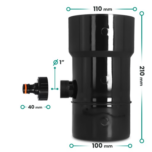 Odzyskiwacz wody deszczowej 110 mm x 1'' GZ czarny z przyłączem pod szybkozłączke 1'' GW x SZ