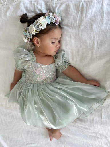 Przepiękna sukienka z błyszczącego materiału w stylu syrenki. Idealna na sesje zdjęciowe oraz różne uroczystości (np. urodziny, chrzest, wesele).