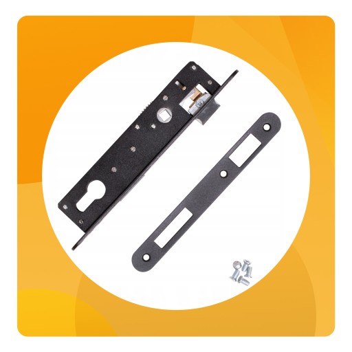 - Zamek wpuszczany 90/22 – smukła obudowa, dźwignia cofająca zapadkę kluczem, otwór na wkładkę.