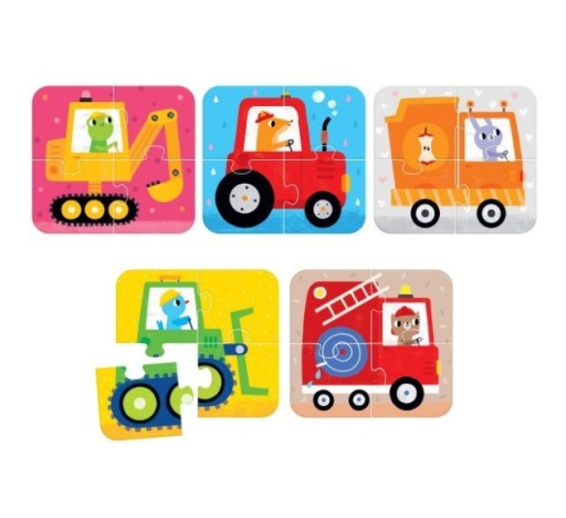 Przepis na dobrą zabawęPołączcie części kolorowych pojazdów. Każde dopasowanie jest sukcesem i powodem do radości. Puzzle są wymienne, dlatego możecie tworzyć także nieoczywiste połączenia. Nazywajcie pojazdy, zwierzątka i kolory na pełnych humoru ilustracjach.