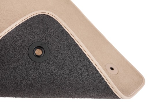 Precyzyjne dopasowanie kształtu każdego elementu sprawia, że dywaniki pozostają stabilne podczas jazdy, jednocześnie nadając wnętrzu pojazdu eleganckiego charakteru. Beżowa lamówka z ekoskóry wzmacnia krawędzie i podkreśla nowoczesny design, wpasowując się w różne typy wnętrz samochodowych.