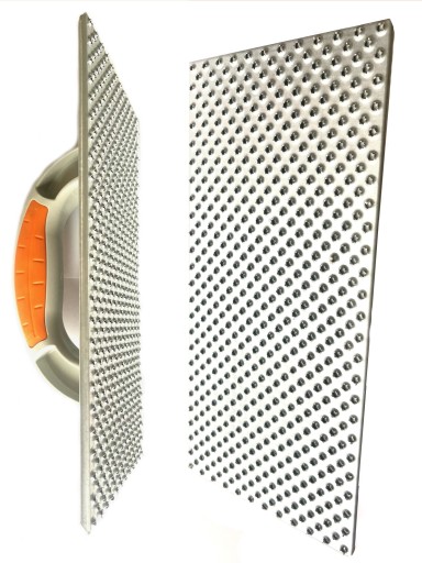 Uchwyt Ergonomiczny dwukomponentowy. Blat roboczy z blachy ocynkowanej z otworami i specjalnym wzmocnieniem zapobiegającym odkształcaniu. Paca przeznaczona jest do wyrównania łączeń płyt styropianowych podczas prac dociepleniowych.
