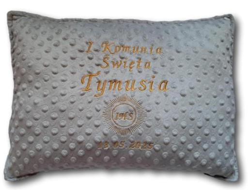 Po zakupie proszę o informacje z jakiego koloru tkaniny minky wykonać poduszkę oraz imię dziecka, datę komunii, a także kolor nici do haftu.
