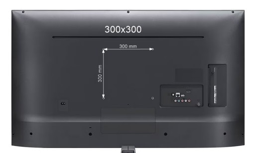 Obok znajduje się przykładowe zdjęcie telewizora z rozstawem otworów VESA 300x300. Odległość między otworami w poziomie i w pionie wynosi 300mm.