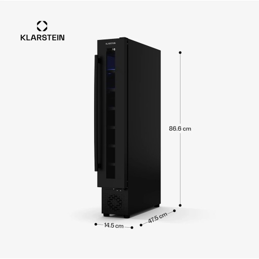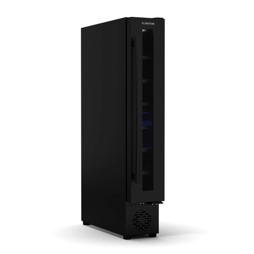 Lodówka na wino marki KlarsteinVinovilla 7 Uno oferuje ekskluzywny sposób przechowywania do 7 butelek wina w optymalnych warunkach. Za sprawą stylowego, czarnego, matowego wzornictwa i czarnych, drewnianych półek, doskonale komponuje się z każdą nowoczesną kuchnią, zarówno jako urządzenie podszafkowe jak i do zabudowy. Dzięki precyzyjnemu zakresowi temperatur od 5 do 18°C , Vinovilla marki Klarstein zapewnia idealną temperaturę do picia wina, a cicha praca tworzy przyjemny klimat w przestrzeni mieszkalnej.