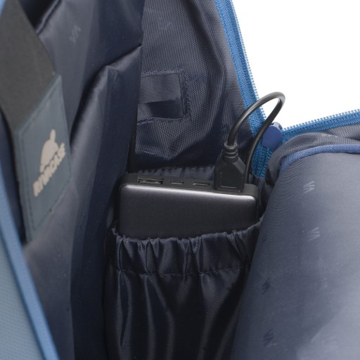 - Podłącz przenośny akumulator do portu USB z boku plecaka, aby ładować urządzenia w podróży
