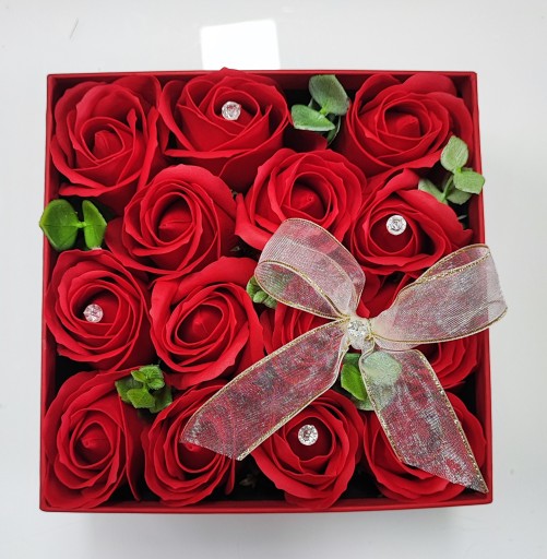 Ozdobne kwadratowe pudełko w kolorze czerwonym z kokardą wypełnione różami to znakomity prezent dla mamy, dla nauczyciela, na walentynki, na urodziny, imieniny ...który sprawi obdarowanej osobie mnóstwo pachnącej radości...