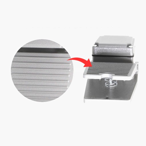Górna część pedału ma żebrowaną, antypoślizgową strukturę, która zapobiega ślizganiu się buta. Dzięki ciężkiej, stabilnej podstawie, wyłącznik nie przesuwa się podczas pracy, co zwiększa jego funkcjonalność i komfort użytkowania.