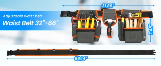 Pas narzędziowy posiada bardzo długie regulowane paski dla obwodu talii 32" - 66". Pas narzędziowy jest wyposażony w szybko odpinaną klamrę ułatwiającą zakładanie i zdejmowanie, a 3 niezależne kieszenie można dowolnie odpiąć w zależności od liczby posiadanych narzędzi.