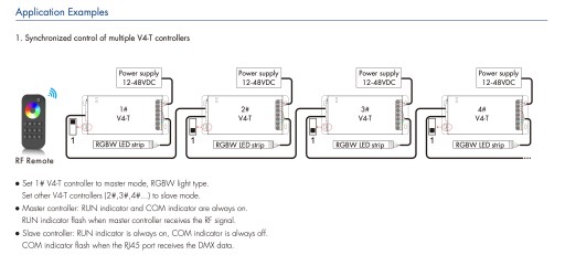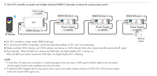 - Tryb slave może również wykorzystywać 4-kanałowy dekoder DMX512 z dekodowaniem 16-bitowym