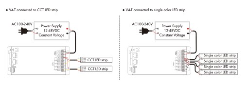 Czterokanałowy radiowy sterownik-ściemniacz LED V4-T(WT) służy do sterowania taśm LED mono/CCT/RGB/RGBW.