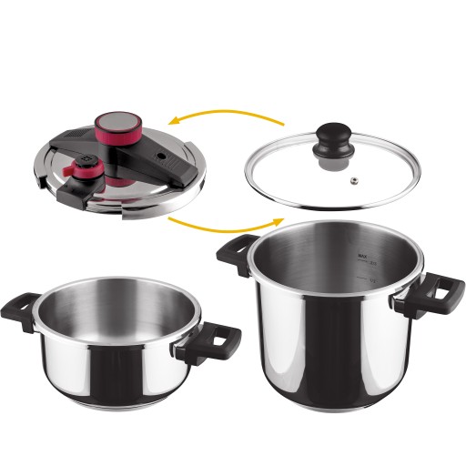 Zestaw szybkowarów 4 + 7l STEAM. Szybkowar został wykonany z najwyższej jakości stali nierdzewnej 18/10 oraz bardzo wytrzymałego tworzywa sztucznego. Łatwa obsługa otwierania pokrywy jedną ręką. Wykorzystując regulację ciśnienia można przygotować bardzo delikatnie, szybko i smacznie dowolne danie. Szybkowar jest wyposażony we wskaźnik ciśnienia, podwójny zawór bezpieczeństwa i okienko bezpieczeństwa, zabezpieczenie przed nadciśnieniem i masywne uchwyty ułatwiające obsługę, które nie palą się. Designerski szybkowar z dnem typu sandwich przeznaczony jest do wszystkich rodzajów kuchenek, w tym indukcyjnych. W zestawie szklana pokrywka.
