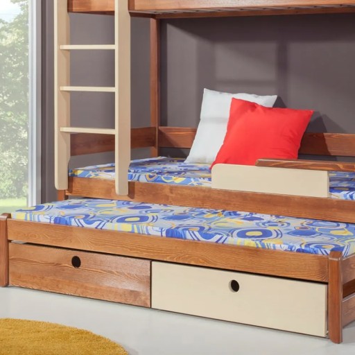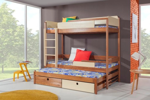 Model Natu III Meblobed to łóżko 3-osobowe złożone z posłania górnego, posłania w dolnej ramie, a także posłania wysuwanego. Pod najniższym posłaniem dostępne są szuflady, które zaoferują dodatkowe miejsce na pościel. Na górnym i środkowym posłaniu można zastosować materac w wymiarach od 80x180 do 90x200 w zależności od wybranego wariantu łóżka. Natomiast posłanie najniższe powinno posiadać materac o 10 cm krótsze. W cenie zestawu zawarte są także stelaże ze sztywnych listew, a pasujące materace można zakupić w naszym sklepie internetowym.