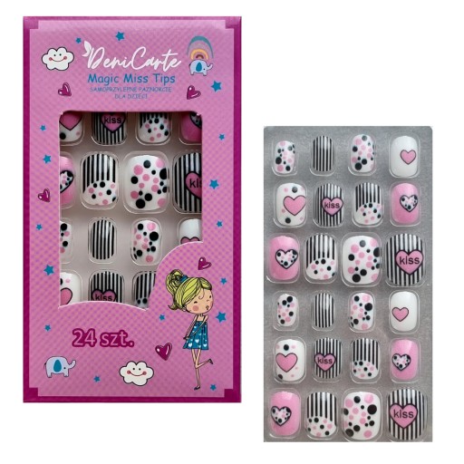 Sztuczne Paznokcie Tipsy Dla Dzieci Samoprzylepne Różowe Kiss Serca 24 Szt