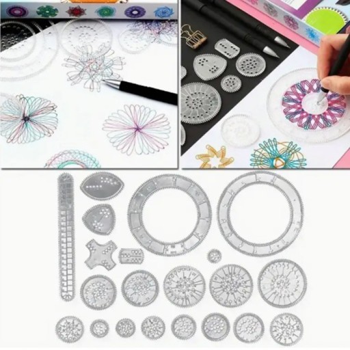 Zestaw do kreatywnej zabawy z pisakami i różnymi szablonami, które umożliwiają dzieciom tworzenie pięknych, skomplikowanych wzorów za pomocą geometrii i ruchu kółek.