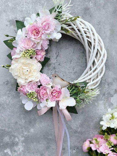 Wianek wiosenny, ozdobiony sztucznymi kwiatami w różowych i kremowych odcieniach, ptaszkiem oraz różnorodnymi dodatkami, liśćmi i kokardką.