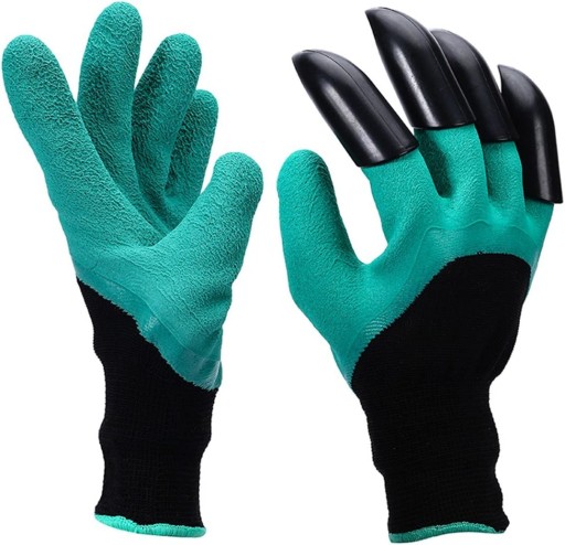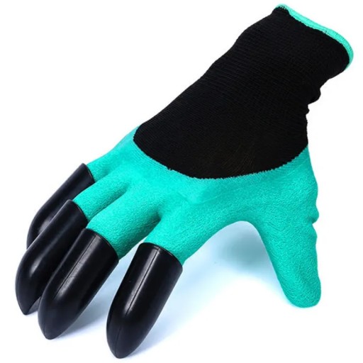 Gumowe, grube oraz wytrzymałe rękawice, prawa rękawica zakończona pazurami z wytrzymałego tworzywa. Plastikowe pazury sprawdzają się doskonale podczas kopania, przesadzania, porządków, czy innych prac ogrodowych. Ich wszechstronność zastępuje potrzebę stosowania części narzędzi ogrodowych, zwiększając sprawność i tempo pracy. Zwiększają kontrolę nad prowadzonymi pracami. Rozmiar rękawic jest uniwersalny.