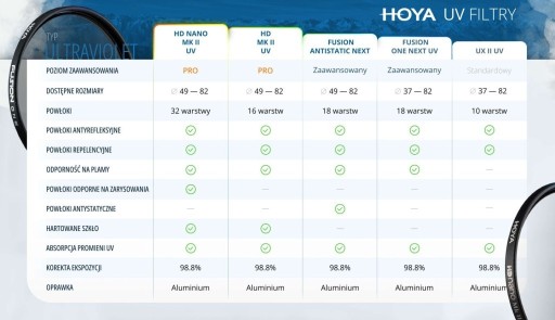 Filtr UV UX II z powłoką hydrofobową to unowocześniona wersja serii HMC UV. Filtry UV są idealnym zabezpieczeniem obiektywu przed czynnikami zewnętrznymi, chroniąc go przed brudem, kurzem czy uszkodzeniami. Ich działanie polega również na odcinaniu promieniowania ultrafioletowego, co pozwala uzyskać lepsze nasycenie kolorów oraz poprawić kontrast zdjęć zwłaszcza przy słonecznej pogodzie.