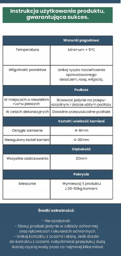 Do uzyskania najlepszego efektu produkt powinien być używany w suchych warunkach atmosferycznych (powyżej temperatury zamarzania), oraz przy upewnieniu się, że kamienie są całkowicie przykryte produktem, ale nieprzemoczone.
