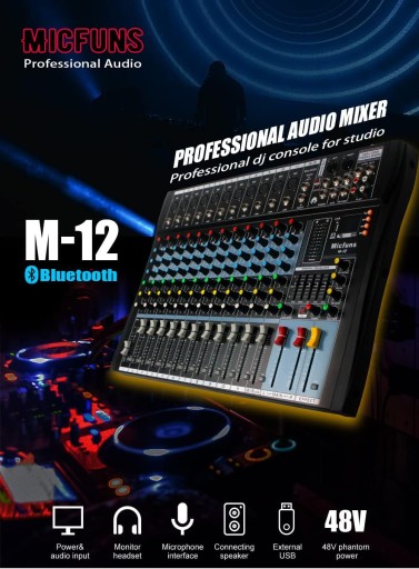 ⭐Micfuns Studio Live mikser na żywo, 12 kanałów, DJ, profesjonalna konsola miksująca stereo, Bluetooth, USB, nagrywanie USB, odtwarzanie przez USB, cyfrowy mikser audio, wzmacniacz⭐