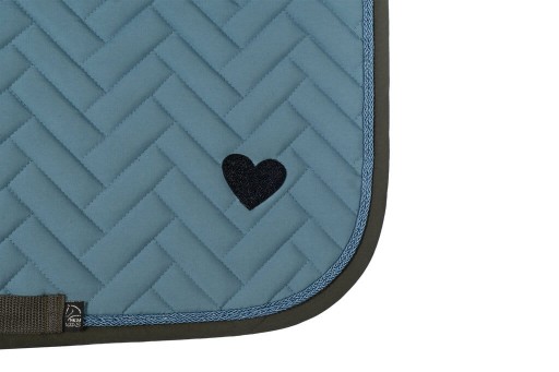 Wyjątkowym akcentem jest dekoracyjna kokarda konkursowa z błyszczącymi, brokatowymi detalami, którą można łatwo odczepić za pomocą rzepu w kształcie serca. Oddychająca podszewka funkcjonalna wspomaga cyrkulację powietrza, zapewniając przyjemny klimat pod siodłem. Modne pikowanie i elegancka lamówka nadają całości stylowego wyglądu.