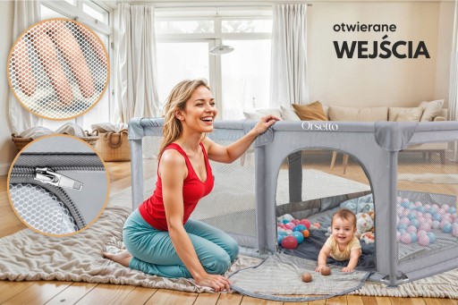 - Kojec wyposażono w dwa boczne wejścia zapinane od zewnątrz, co zapobiega samodzielnemu otwarciu przez dziecko. Jest to wygodne rozwiązanie dla opiekunów, eliminujące potrzebę częstego podnoszenia malucha ponad ściankami, co chroni plecy dorosłych.