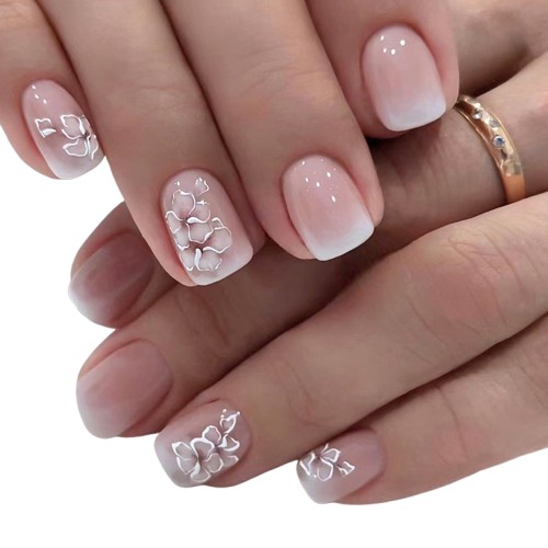 ✔️ Gotowe tipsy, paznokcie kwadrat. Naklejane sztuczne paznokcie zdobione. Tipsy ombre w kolorze nude ze wzorem. Kwiatowe zdobienie.