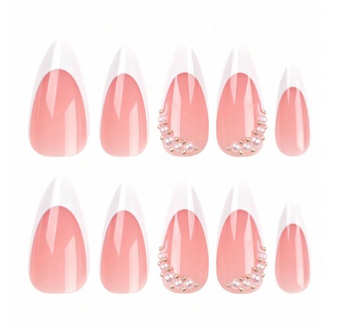 ✔️ Tipsy gotowe, paznokcie almond. Naklejane sztuczne paznokcie zdobione. Stylizacja z klasycznym french'em ozdobiona perłami. Doklejane paznokcie błyszczące. Tipsy delikatny french.