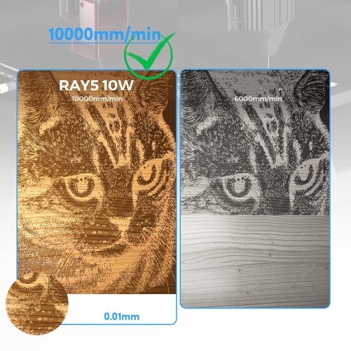 - RAY5 10W maksymalna wydajność cięcia to 20mm basswood i 30mm akryl