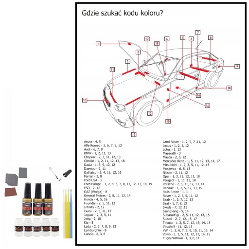 Odpowiedni kod koloru dla Twojego modelu samochodu możesz odszukać na tabliczce znamionowej pojazdu (patrz: rozmieszczenie tabliczek znamionowych).
