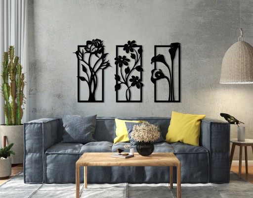 Ажурная картина 3D Черный Триптих Цветы Украшение стены Орнамент 68x115,5 см