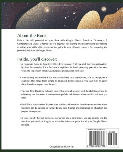Unlock the full potential of your data with Google Sheets Functions Dictionary: A Comprehensive Guide. Whether you’re a beginner just starting or an experienced user looking to refine your skills, this comprehensive guide is your ultimate resource for mastering the powerful functions of Google Sheets. Inside this book, you will discover: A Complete Guide to Functions: Dive deep into over 130 essential functions categorized by their functionality. Each function is explained in detail, providing you with the tools you need to perform complex calculations and analyses with ease. Step-by-Step Instructions: Each function includes clear descriptions, syntax, and practical examples that range from simple to advanced. Follow along as you learn how to apply these functions to your own datasets. Tips and Best Practices: Enhance your efficiency and accuracy with helpful tips on how to effectively use functions. Avoid common pitfalls and discover shortcuts that will save you time. Real-World Applications: Explore case studies and scenarios that demonstrate how these functions can be applied in various fields, from finance and marketing to education and project management. A User-Friendly Layout: With easy navigation and a clear index, you can quickly find the functions you need, making it an invaluable reference guide for all your Google Sheets projects. Transform how you manage, analyze, and visualize data with the power of Google Sheets functions. Whether you're preparing reports, conducting data analyses, or automating tasks, this book will empower you to work smarter, not harder. Get your copy today and start your journey to becoming a Google Sheets expert!