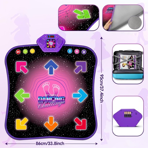 ✅- Nasza mata do tańca ma 8 podświetlanych strzałek z 3 poziomami trudności, 9 opcjami poziomów, 5 trybów (✅tryb perkusyjny, ✅tryb taneczny, ✅tryb piosenki, ✅tryb pamięci, ✅tryb Bluetooth), aby taniec był przyjemniejszy.