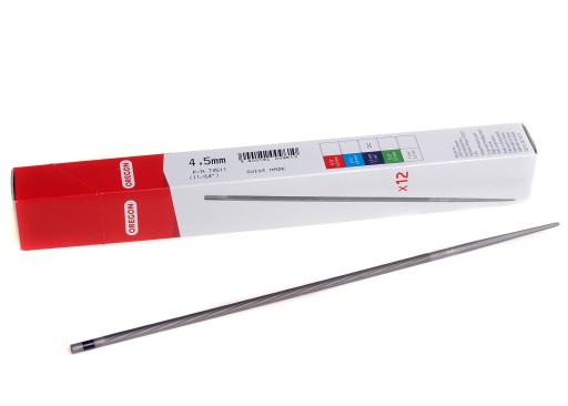 Pilnik okrągły Oregon 4,5 do łańcucha o nacięciu krzyżowym z precyzyjnie przyciętymi kątami zębów.
