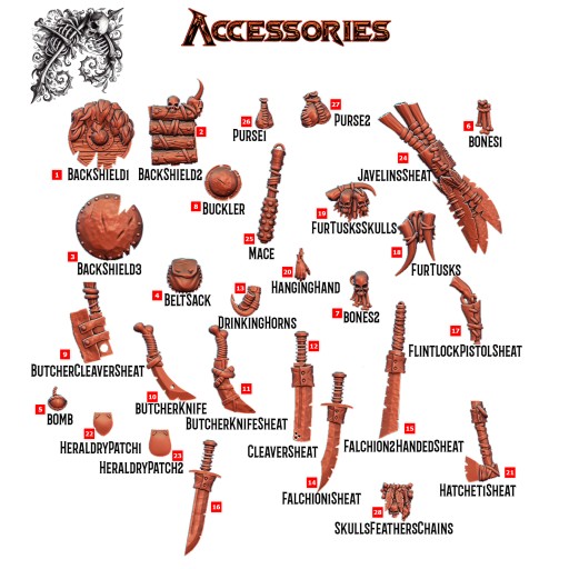 Akcesoria to np. modele broni bez dłoni ogra, albo tarcze do zawieszenia na plecach, sakiewki czy inne ozdobniki. Ciała nie mają dedykowanych miejsc na te akcesoria - możesz przykleić je gdzie tylko zechcesz - na plecach, przy pasie, na ramieniu...