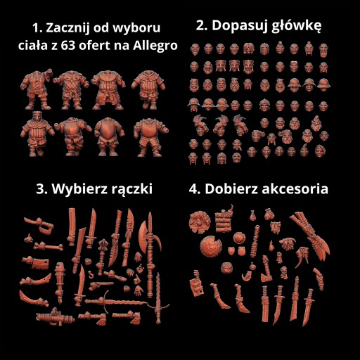 Zacznij od wyboru ciała z 63 ofert na allegro i dodaj ją do koszyka. Teraz wybierz 4 dowolne elementy - np. 1 główkę, 1 lewą i 1 prawą rączkę, 1 akcesorium.