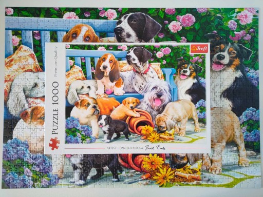 Puzzle składające się z 1000 elementów przedstawiające słodkie psy bawiące się w ogrodzie. Po ułożeniu powstanie obrazek o wymiarach 683x480 mm. Produkt został wykonany z wysokiej jakości materiałów, z zastosowaniem specjalnego kalandrowanego papieru odbijającego światło, co ułatwia układanie. Produkt został wyprodukowany w Polsce, a do produkcji zostały użyte materiały ekologiczne.