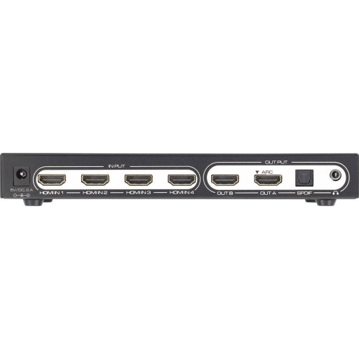 Oszczędź sobie częstego przełączania odtwarzacza DVD, odtwarzacze Blu-ray, konsole do gier itp Ten przełącznik HDMI Matrix pozwoli na wyświetlanie sygnału aż wejście do dwóch urządzeń wyjściowych jednocześnie. Lub też na obu urządzeniach wyjściowych wyświetlić każdorazowo inny obraz. Rozdzielacz sygnału wideo: Obraz z urządzenia źródłowego, takich jak odtwarzacze DVD, odtwarzacz Blu-ray, konsola do gier, itp wyświetlany jest na dwóch telewizorach jednocześnie. Funkcją przełącznika: Przy tej funkcji na telewizorze 1 wyświetlany jest obraz z odtwarzacza DVD, a na telewizorze 2 wyświetlany jest obraz z podłączonej konsoli do gier. Funkcja Picture in Picture - Wyświetl zawartość wszystkich wejść na ekranie Obraz z aktywnego wejścia zostaje wyświetlony można pokazać dodatkowo obraz z pozostałych wejść w formie pomniejszonej. Bez konieczności zakłócania aktualnego obrazu. Odtwarzaj obraz np. na konsoli do gier i oglądaj w małym oknie obok ulubione DVD. Łatwe przełączanie Przełączanie odbywa się za pomocą przycisków na urządzeniu lub za pomocą dołączonego pilota. Funkcja EDID Wybierz jedną z trzech opcji audio w prosty sposób: - Audio 2.0 - dźwięk 5.1 - Sygnał audio zostanie rozpoznany i można zapętlić Ponadto, sygnał audio może być sprzężony z sygnałem HDMI. Posiada złącze Toslink, oraz złącze jack 3,5 mm. Zasilanie przez zasilacz 24 V. Oprócz tego obsługuje rozdzielczość telewizorów 4K. Większe bezpieczeństwo - z przetestowanym zasilaczem Dołączony zasilacz nie tylko zapewnia wystarczającą moc. Zasilacz konwertera SpeaKa Professional jest zgodny z surowymi wytycznymi UE pod względem wydajności i bezpieczeństwa. To chroni środowisko i chroni przed nieprzyjemnymi niespodziankami.