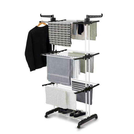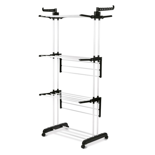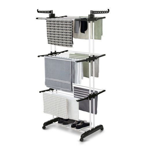 Biała suszarka balkonowa Tadar 75 x 64 x 175 cm zapewnia wygodne suszenie prania w każdych warunkach (balkon, taras, mieszkanie). Z nią możesz wygodnie wysuszyć mokrą odzież całej rodziny. Bardzo dobrze sprawdzi się w domu oraz przy większym praniu (np. pościeli). Powierzchnia suszenia tego modelu jest naprawdę duża oraz modyfikowalna na kilka sposobów. Po pierwsze, produkt jest 3-poziomowy. Po drugie, ma specjalne uchwyty do zawieszenia ubrań na wieszakach. Po trzecie, wyposażono go rozkładane skrzydła na każdym poziomie. Dzięki solidnej konstrukcji ze stali węglowej malowanej proszkowo suszarka będzie ci służyć przez lata. Kółka ułatwiają przestawianie. Nie zarysują przy tym twoich paneli. Model jest lekki oraz wygodny w przechowywaniu. Będzie stabilnie stał nawet podczas większych podmuchów wiatru.