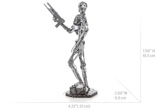 Terminator T-800, stworzony w 2018 roku, to fikcyjny cyborg z serii filmów „Terminator”, grany przez Arnolda Schwarzeneggera. Wyposażony w metalowy endoszkielet pokryty żywą tkanką, jest autonomicznym mechanizmem zaprojektowanym do walki z ocalałymi ludźmi po dniu sądu. Terminator posiada baterię, która zapewnia mu zasilanie przez 120 lat, a w przypadku poważnych uszkodzeń aktywuje zasilanie awaryjne, co pozwala mu na dalsze funkcjonowanie. Zainteresowanie cyborgiem wzmacniają modele wykonane z blachy nierdzewnej, które są precyzyjnie odwzorowane i dostarczane w kopertach o wymiarach 23,5 x 12,8 x 0,3 cm, przyciągając zarówno początkujących, jak i doświadczonych kolekcjonerów.