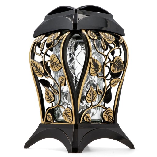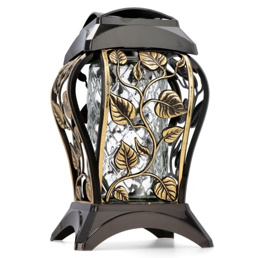W centrum znajduje się przezroczysty, szklany wkład z delikatnym tłoczeniem, który pięknie rozprasza światło płomienia — tworząc atmosferę ciepła i refleksji. Otacza go ażurowa, czarna rama, a jej przestrzenie wypełniają precyzyjnie wykonane, złote gałązki z liśćmi, niczym delikatne pnącza oplatające wspomnienia. Ten kontrast czerni i złota, masywności i delikatności, przywodzi na myśl trwałość pamięci splecioną z ulotnością wspomnień. Motyw liści – symbol życia i odrodzenia – wprowadza cichą nadzieję i poczucie ciągłości.