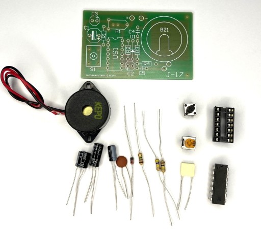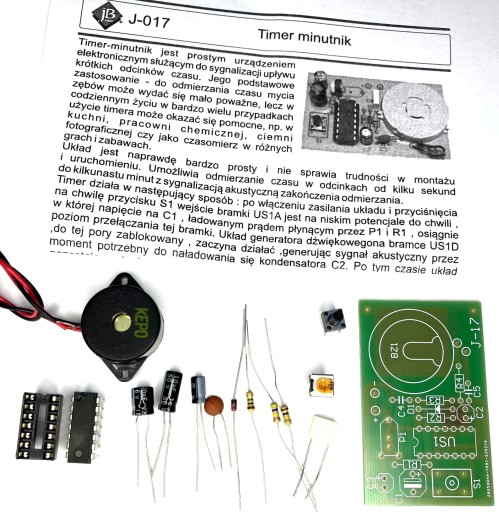 Timer działa w następujący sposób : po włączeniu zasilania układu i przyciśnięcia na chwilę przycisku S1 wejście bramki US1A jest na niskim potencjale do chwili , w której napięcie na C1 , ładowanym prądem płynącym przez P1 i R1 , osiągnie poziom przełączania tej bramki. Układ generatora dźwiękowego na bramce US1D ,do tej pory zablokowany , zaczyna działać ,generując sygnał akustyczny przez moment potrzebny do naładowania się kondensatora C2. Po tym czasie układ pozostaje w stanie spoczynkudo następnego naciśnięcia S1. Potencjometrem P1 ustawia się długość odmierzanego odcinka czasu.