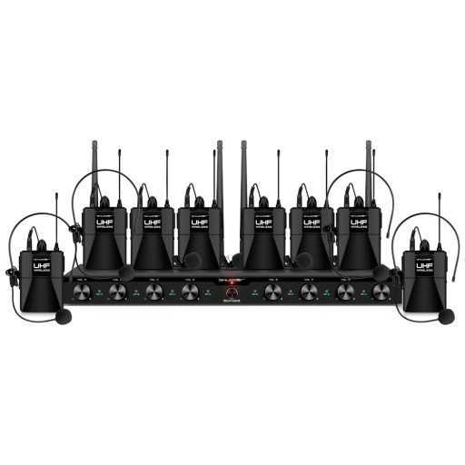 Ośmiokanałowy zestaw mikrofonów bezprzewodowych Shudder SDR1084 UHF 8 mikrofonów nagłownych z mikroportami