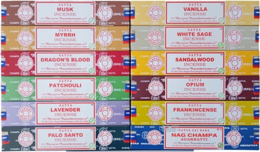 INDYJSKIE NATURALNE KADZIDEŁKA PYŁKOWE SATYA- MIX 12 POPULARNYCH ZAPACHÓW (zestaw 1):