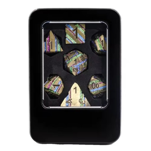 Zestaw 7 metalowych kości idealnych na sesję RPG. Kostki są zapakowane w czarne, metalowe pudełko.