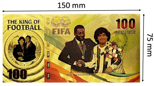 Pięknie wykonany z PCV banknot z wizerunkiem PELEGO I MARADONY powlekany folią w kolorze złota.