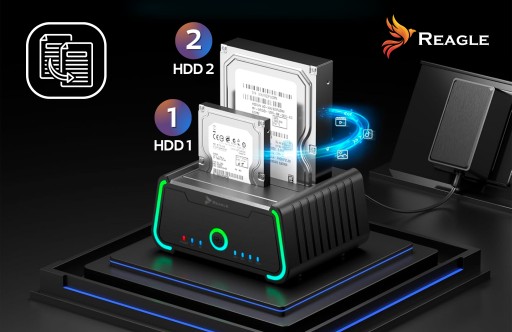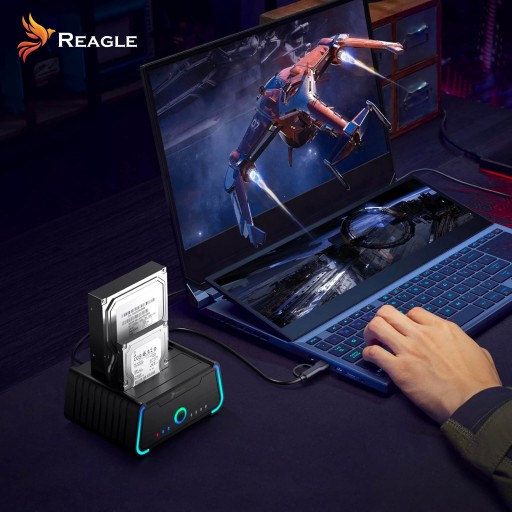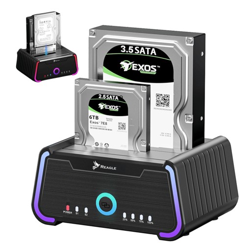 - Dwuzatokowa stacja dokująca marki Reagle, która umożliwia łatwy dostęp do dwóch dysków twardych SATA I/II/III wielkości 2,5” oraz 3,5”.