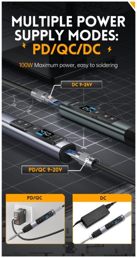 Lutownica inteligentnie dostosowuje moc grzania, osiągając maksymalnie 100W przy odpowiednim zasilaniu (9-20V) przez port USB-C. Wsparcie dla protokołów Power Delivery (PD) i Quick Charge (QC) oraz standardowego zasilania DC daje dużą elastyczność – możesz używać zasilaczy sieciowych, jak i powerbanków.