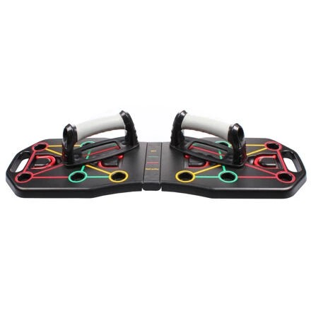 Wielofunkcyjna składana deska push-up Excellent Octagonal jest przeznaczona do ćwiczeń i wzmocnienia pleców, tricepsów, piersi i pleców. Wystarczy po prostu posadzić odpowiednie podpórki w konkretnej, zróżnicowanej kolorystycznie pozycji na desce i można zacząć ćwiczyć. Deska fitness oferuje 9 ustawień pozycji ćwiczeń: 4 na ramiona (kolor czerwony), 2 na triceps (kolor zielony) i 3 na plecy (kolor żółty). Składana płyta i podłokietniki wykonane są z wytrzymałego tworzywa ABS, a podłokietniki są dodatkowo wyposażone w silikonowe antypoślizgowe uchwyty. Po rozłożeniu deska ma wymiary 63,5 x 20,5 x 2 cm i waży prawie 1 kg, uchwyty podpórek mają 13 cm szerokości. Płyta jest dodatkowo uzupełniona dwoma parami pierścieni ciągnących, które służą do mocowania elastycznych gumolanów, aby wzbogacić program fitness treningowy o dodatkowe ćwiczenia. Jednak elastyczne gumy z uchwytami nie są dołączone. Maksymalne obciążenie 100 kg. Deska push-up Excellent Octagonal to praktyczny sprzęt do treningu siłowego w domu.